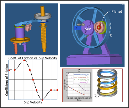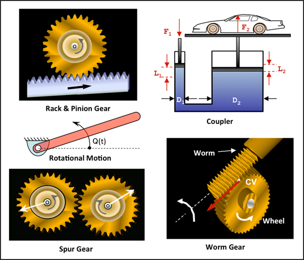 - モーション、カプラー、およびギア拘束: モーション拘束は、モデル内の2つの座標系間の入力の加振を定義します。モーションの入力は、並進または回転であり得ます。式は、モーションの特徴を定義します。カプラー拘束は、2つまたは3つのジョイントの自由度間の代数的な関係を定義します。この拘束は、理想化された平歯車、ラックアンドピニオンギア、差動装置、油圧シリンダーのモデル化に使用されます。これらの一般的な例については、図 4をご参照ください。