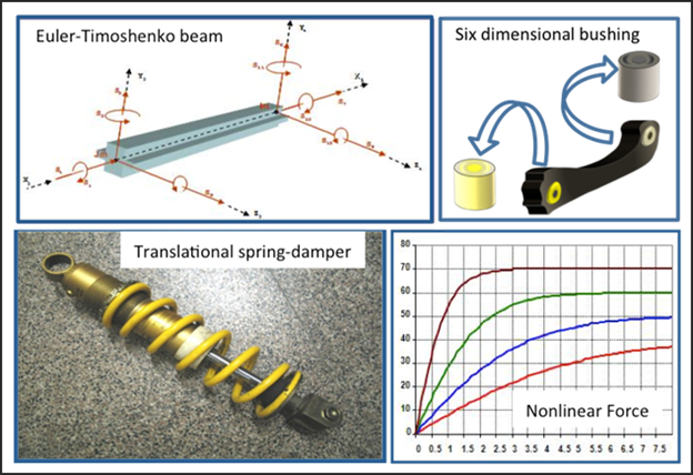 - フォースおよびフレキシブルな結合: パートは拘束のみならず、フォース要素によっても結合され得ます。拘束はシステム内の代数的な関係を定義し、これらはワークレスな理想化された結合を表します。一方、フレキシブルな結合は、フォース要素と共にモデル化されます。フォース要素は2つ以上のパート間にかかり、それらは並進または回転であり得ます。action-onlyまたはaction-reaction特性をもつことが可能です。それらはシステムの変位、速度、およびその他のシステム内の状態に非線形的に依存することがしばしばあります。フォース、特に実験的に計測されたフォースは、時間の関数として表されることがあります。例として、航空機の翼にかかる空気力や、路面によって車両の軸にかかる道路荷重が挙げられます。MBSツールはすべて、フォースコネクターの大きなセットをサポートします。 図 5 は、フォースコネクターの例を示しています。