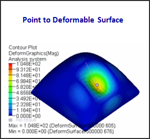 - 剛体-弾性体および弾性体-弾性体接触: これらは通常、点-可変曲線フォース要素、点-可変面フォース要素、または可変面-可変面フォース要素としてモデル化されます。曲線または面は、シミュレーション中に変形する機能があります。 図 7 は、球体と高度に変形可能な面との衝突を示しています。