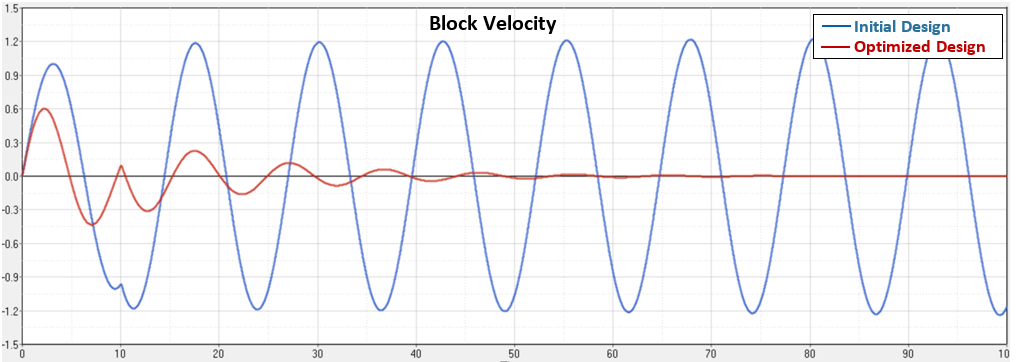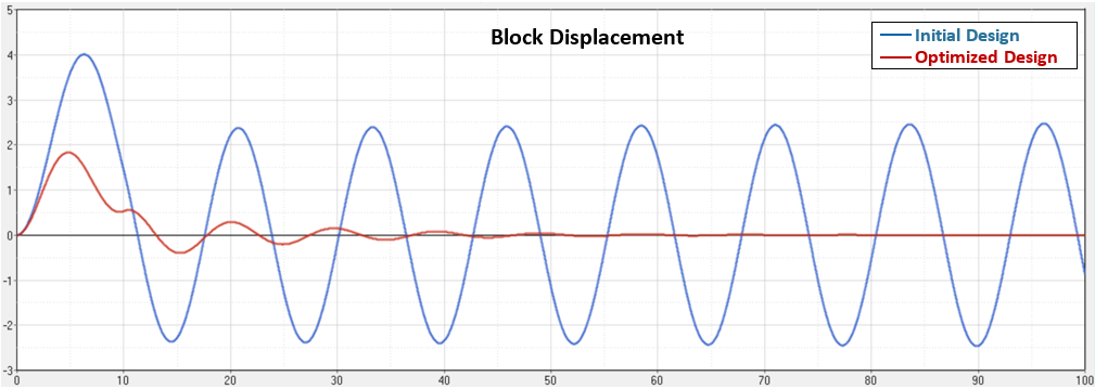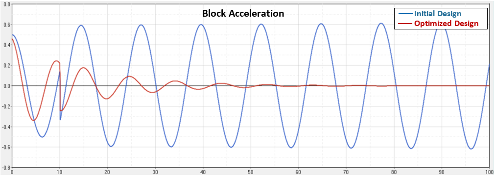 初期設計と最適化した設計の両方について、このブロックの動的応答をプロットしています。変位、速度、および加速度が改善されています。図 2.
