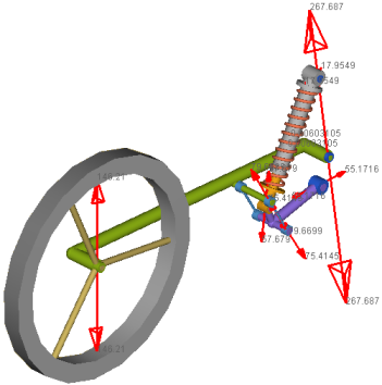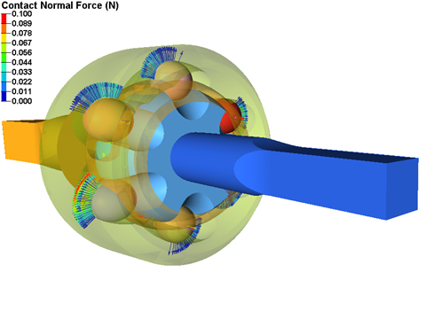 剛体の接触要素が含まれたシミュレーションの最中に、MotionSolveは、垂直抗力、摩擦力、滑り速度など、いくつかの接触関連の量を計算します。これらはシミュレーション後にH3Dに書き込まれ、HyperViewで可視化できるようになります。