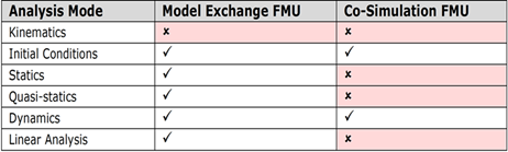 MotionSolveのFMUの解析サポートは、FMUのタイプによって異なります。解析サポートの概要を下の表に示します。サポートされていない解析モードはサーモンピンクで表示されています。