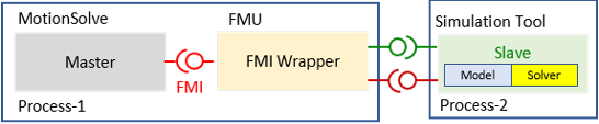 MotionSolveとFMUが異なるマシン上で動作している場合は、MotionSolveを実行しているマシンのIPアドレスがFMUに渡され、これによってFMUはMotionSolveとやり取りすることができます(例えば、ip_address = “172.16.254.1”)。
