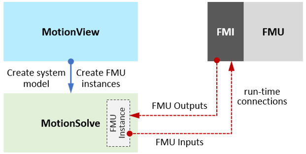 FMIは、FMUと呼ばれる実行ファイルによって実装されるインターフェースを定義します。FMI内の関数は、MotionViewがMotionSolveでFMUのインスタンスを作成するために使用されます。MotionSolve内のFMUは、一連の微分方程式と代数方程式で記述される汎用エンティティです。実行時に、MotionSolveがこれらの方程式または偏導関数を評価する必要がある場合、MotionSolve内のFMUインスタンスはFMI内で定義された関数を介してFMUオブジェクトとやり取りします。これらの関数は、MotionSolveから必要な値を入力として“取得”し、FMUから必要な値をMotionSolveへの出力として“返し”ます。これは、下の図に示すとおりです。