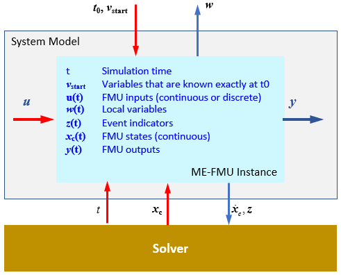 - ソルバーから現在のシミュレーション時間tとFMUの連続状態xcを取得します(t0の時点で、ソルバーはFMUから提供された初期値を返します)。
