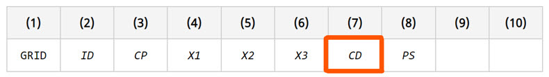 - 変位出力節点の自由度、変位出力、および拘束は、変位座標系で適用され、解釈されます。この座標系は、GRIDバルクデータのCDフィールドで定義されます。デフォルトは、基準座標系です。