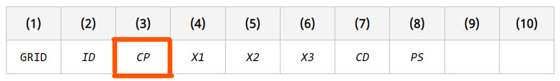 - モデルジオメトリの定義モデルのジオメトリは、参照座標系で表された節点を介して定義されます。この座標系は、GRIDバルクデータのCPフィールドで定義されます。デフォルトは、基準座標系です。