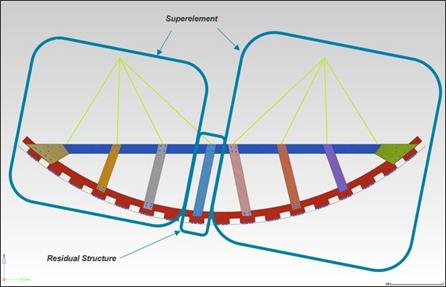 スーパーエレメントは、構造または構造の一部の挙動とパフォーマンスの縮退表現です。これらのマトリックスを使用したシステム方程式が解かれ、構造の挙動がシミュレートされます。これは、直接マトリックス入力またはスーパーエレメントと呼ばれています。スーパーエレメントが作成された後に残るフルモデルの一部がレジデュアル構造です。縮退した荷重、質量、剛性、および減衰マトリックスは、複数の方法を使用して生成することができます。フルモデルが慎重に検証され、スーパーエレメントとして縮退可能なセクションまたはパートが特定されます。スーパーエレメントとレジデュアル構造間の境界が結合 / インターフェースポイントを使用して識別されます。インターフェースポイントを特定したら、残りの構造(レジデュアル)をフルモデルから削除できるようになります。選択されたスーパーエレメント作成方法に応じて、対応するエントリが追加されます(CMSMETH)。