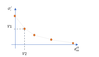 - 亀裂開口は、正の主応力( )vs亀裂開口ひずみ( )の形で表されます。一連の値(V1、V2)は、( 、 )のテーブルを定義します。