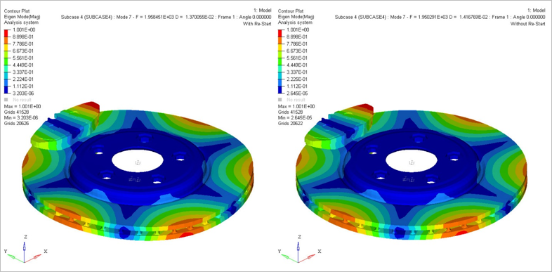リスタートあり / なしでのブレーキスキールモードは図 2に示すとおり、周波数1950.2 Hzで非常に接近しています。図 2. 複素固有値解析からの不安定なモード