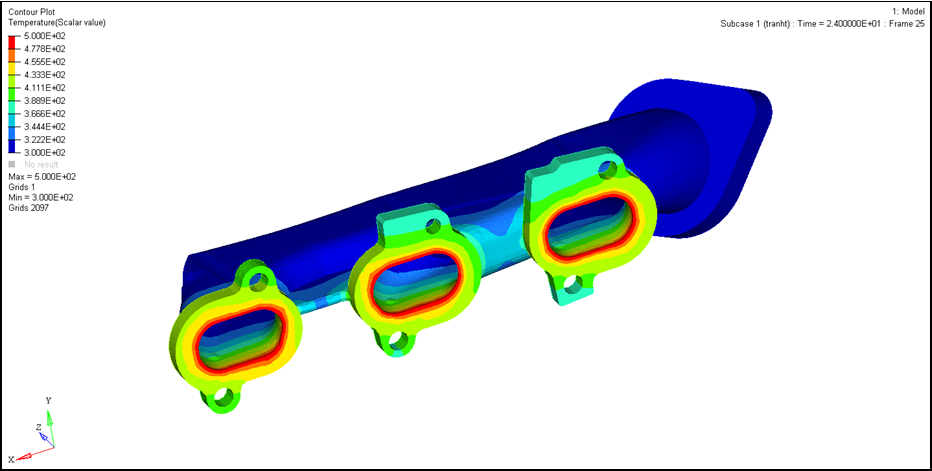 構造過渡熱伝導解析の熱FSI解析において、デフォルトで、実行時にモニター結果を<filename>_ht.h3dファイル内で参照できます。このH3Dファイルは実行中にHyperViewで表示して、各時間ステップの温度結果を監視できます。