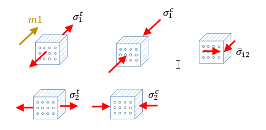 ここで、 、 、 、 、 はそれぞれ、方向1の引張、方向2の引張、方向1の圧縮、方向2の圧縮、せん断での限界強度です。