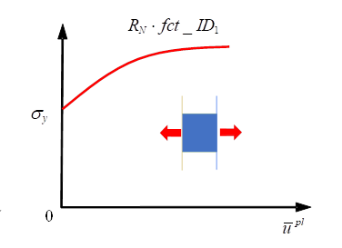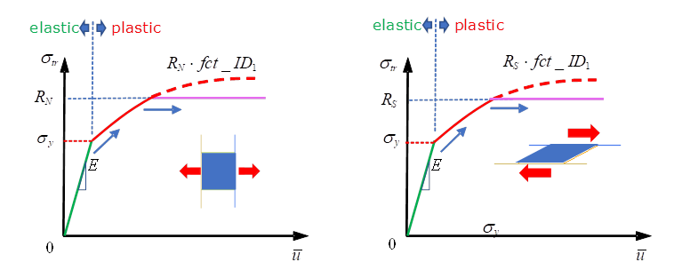 - 降伏応力(fct_ID1で定義)に達した後、材料は塑性相に移行します。最大応力RN(引張)またはRS(せん断)に達した後は、材料内の応力は増加しません(図 1)。