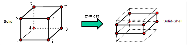 要素HA8、HEPH、およびBRICK20は板厚方向の一定応力を設定することによりソリッド-シェル要素に変換することができます。