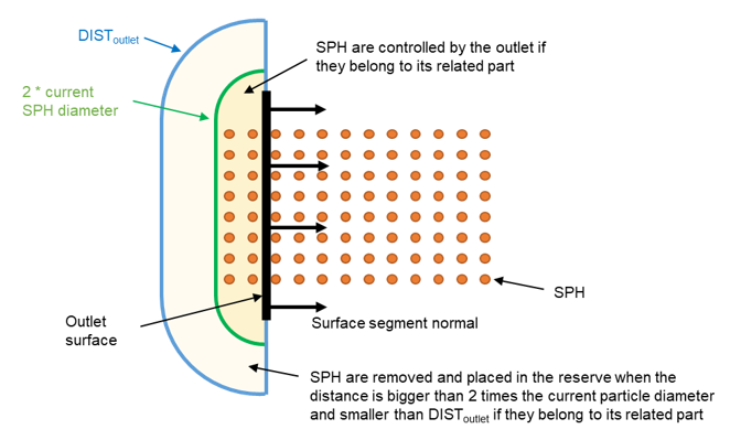 - 流入条件の場合は、関連するパートに対して非アクティブな粒子を使用できる限り、そのパートに属する粒子が入力されます。条件に関係するパートに属する粒子の挙動は、サーフェスの正の側で流入サーフェスからDist以内の距離にあるすべての粒子の条件の特徴に対して設定されます。