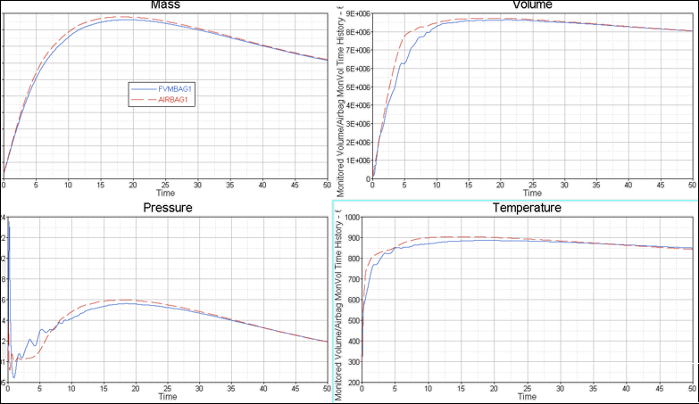 エアバッグのパラメータ、質量、体積、圧力、および温度はプロットし、指定したエアバッグ体積および注入した気体の物理的スペックの質量と比較する必要があります。