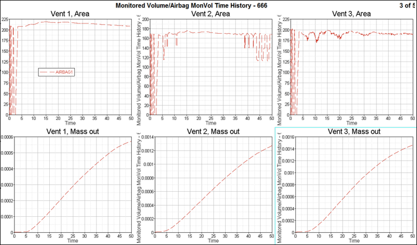 各ベントについて、ベント面積およびベント流出はプロットされ、エアバッグ内の実際のベントホールの物理サイズと比較される必要があります。図 2.