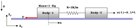 The model depicts a one dimensional problem. Movement is only allowed in the global X direction. The system consists of two masses, Body 1 and Body 2 that are connected by a spring of stiffness K = 2 N/m. The mass of each body is 1 Kg. The bodies rest in the XY global plane. A motion of 0.1*time is applied in the global x-direction at the CM of body 2. The center of mass of body 1 is denoted by marker 666. The coordinate x defines the x-displacement of Body 1. It is measured by the MotionSolve expression DX(666). The sliding velocity of Body 1 is measured by the expression VX(666).