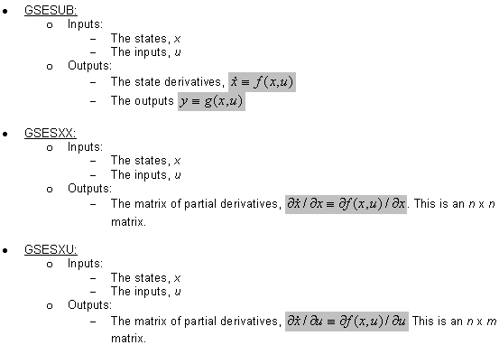 that are defined via user defined subroutines.Five user subroutines may be needed. The first, GSESUB is required. The other four, GSEXX, GSEXU, GSEYX, GSEYU, are required only when a stiff integrator (VSTIFF or MSTIFF) is used.