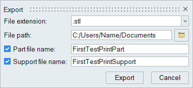 - Click Export. The part and support files are generated separately and can be found in the File path location.