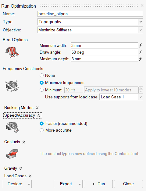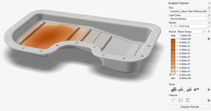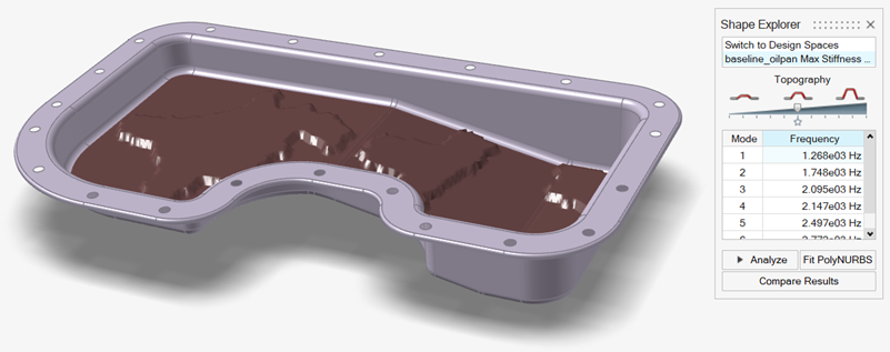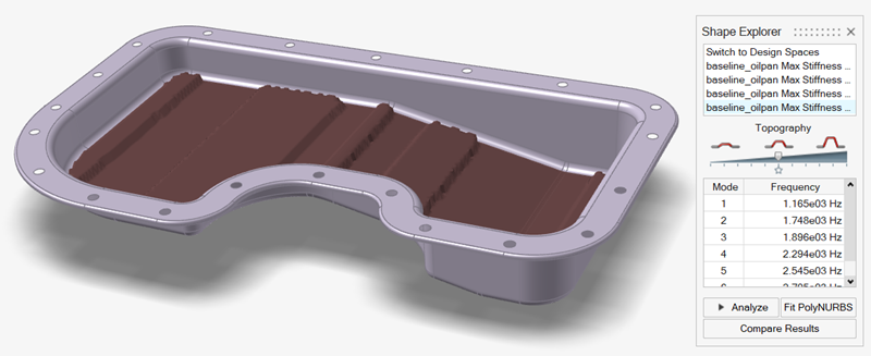 In this tutorial, you will run a baseline analysis and topography optimization on a typical oil pan design space.
