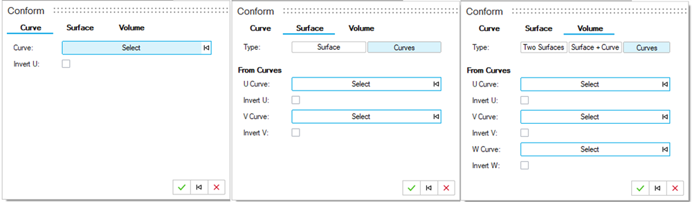 共形坐标空间可以是一维、二维或三维的,由一组定义参数化的 U、V 和 W 方向的几何特征来定义。有许多选项可用于定义二维和三维参数化;这些选项可在“贴合”操作面板上看到。