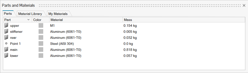 可以通过“材料”工具打开“零件和材料”列表,用于创建、导入和管理材料。