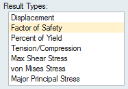 线性静态分析会针对每一种工况生成多种不同的结果类型:位移、安全系数、屈服百分比、拉伸与压缩、最大切应力、米塞斯等效应力、主应力以及主应变。点击结果类型列表中的对象,查看相应的结果。