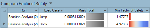 结果以表格格式进行对比。通过添加额外的列可以显示“运行分析”窗口中的其他结果类型和参数。红蓝色的条纹与“分析浏览器”中的图例相对应;条纹的宽度表示结果的大小。“分析浏览器”中上边界和下边界的改变会自动反映在“对比分析结果”表中。