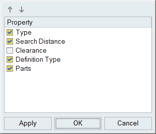 更改搜索距离 | 选择表中的单元格,然后输入值。 | 此项显示的是最小间距(两个零件之间准确的最小距离)。 该表中为单个接触定义的搜索距离将覆盖操作栏的“寻找选项” |