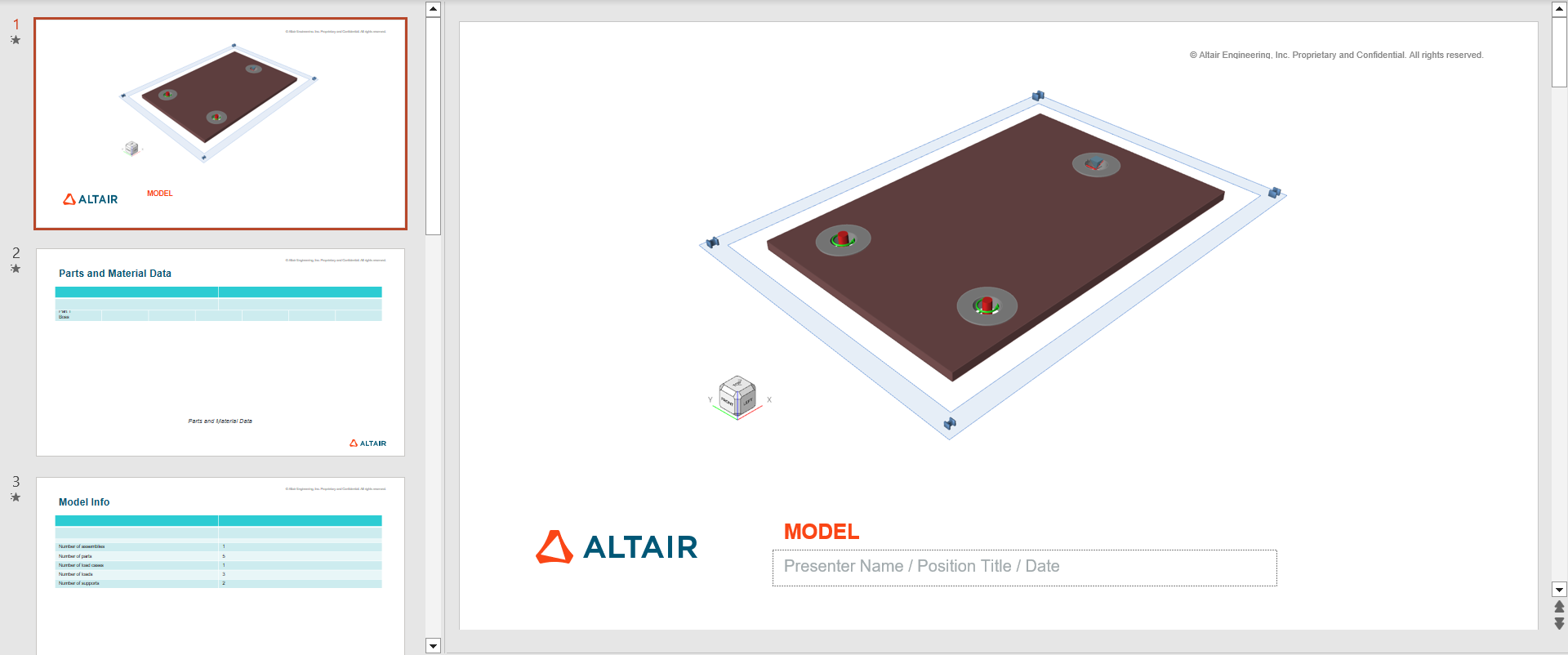 创建快速报告 使用保存的设置生成分析报告。可以将报告导出为 .ppt 或 .pdf 文件。 首先,运行结构分析。 要自定义报告设置,请参见 自定义报告设置并创建报告。 在“结构仿真”功能区,选择快速报告。 提示: 要查找并打开工具,按 Ctrl+F。更多信息请见查找和搜索工具。 浏览至要保存文件的位置。默认位置是 C:\Documents\Altair\reports。 注: 要更改位置,请进行如下操作: 在文件菜单上,选择偏好设置按钮。 在类别下,选择报告。 更改保存设置。更多信息请见偏好设置:报告。 输入文件名。 选择文件格式: PPTX PDF 点击 保存。