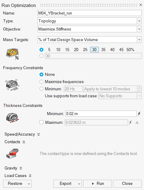 - 在“运行优化”窗口中,将名称更改为 Bracket_2Sym_BallBall。