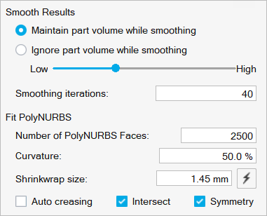 - 您还可以在此对话框中调整设置,使 PolyNURBS 适应优化后的结果。先尝试使用默认设置。更多信息请见使 PolyNURBS 适合生成的形状。