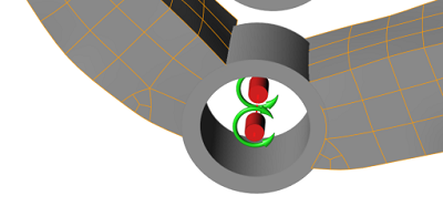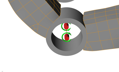 使用滚轮放大 PolyNURBS 与三个 Boss 零件接触的区域。请注意,PolyNURBS 零件在这些非设计空间附近有空隙。