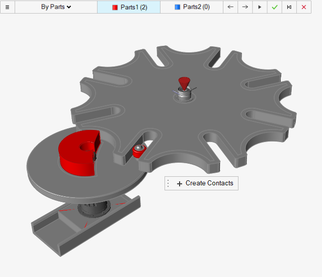 接触图标上的计数器现在报告模型中有两个接触。该操作可以将三个零件之间的单一接触分割成两个零件对之间的两个接触。要将零件个别化的原因是为了绘制每个接触对的运动接触结果。