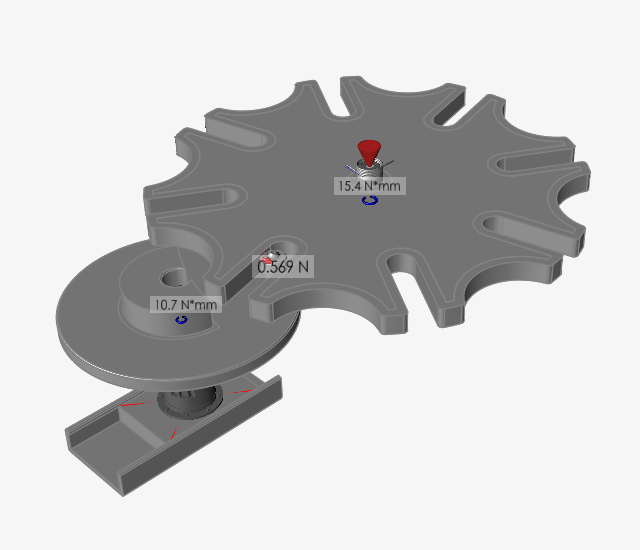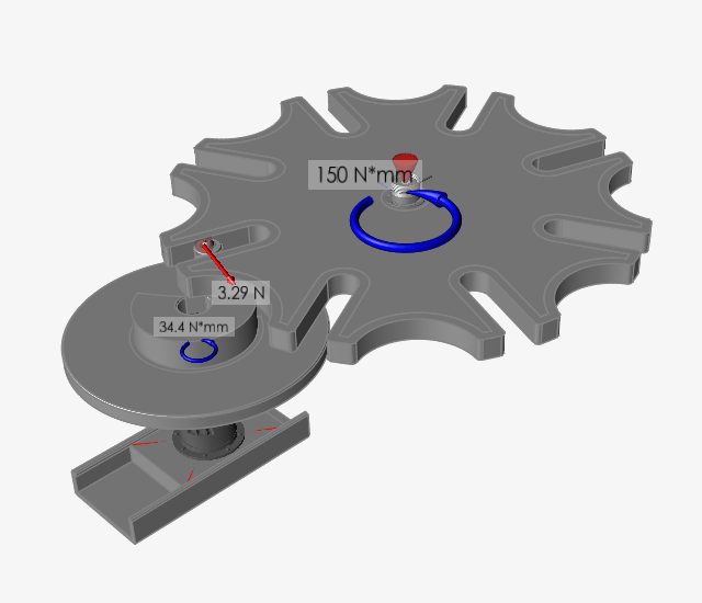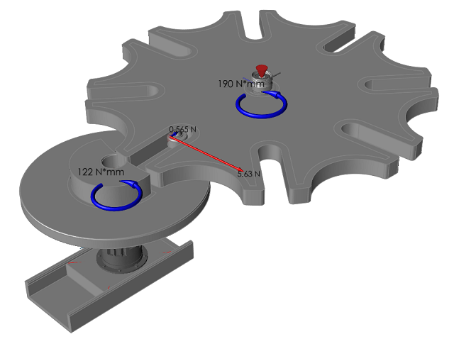 4. 按动画工具栏上的播放按钮。当槽轮围绕其轴转动时,请注意转动电机和扭力弹簧中的接触力和扭矩如何变化。
