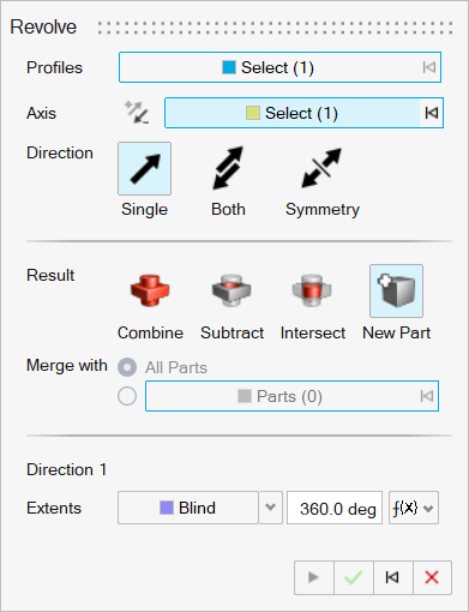 - 零件:选择单选按钮将旋转后的形状与所选零件合并。然后选择您要将其与旋转后的形状合并的零件。