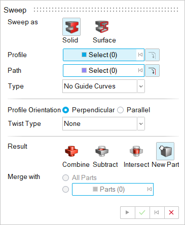 沿路径扫略轮廓以创建实体或曲面。创建新零件,或将扫略形状与现有零件合并、相减或相交。