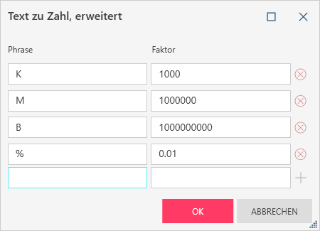 rechts neben einer Kombination aus Phrase und Faktor können Sie den angegebenen Faktor ändern, z. B. durch Einfügen von Kommas, um die Tausender- und Millionenstellen anzugeben. Eine neue Phrase/Faktor-Kombination kann durch Klicken auf das Symbol Hinzufügen