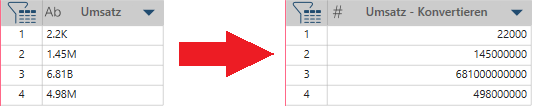 In diesem Beispiel ist Umsatz die ursprüngliche Textspalte und Umsatz – Konvertierren die Spalte mit den umgewandelten Werten.