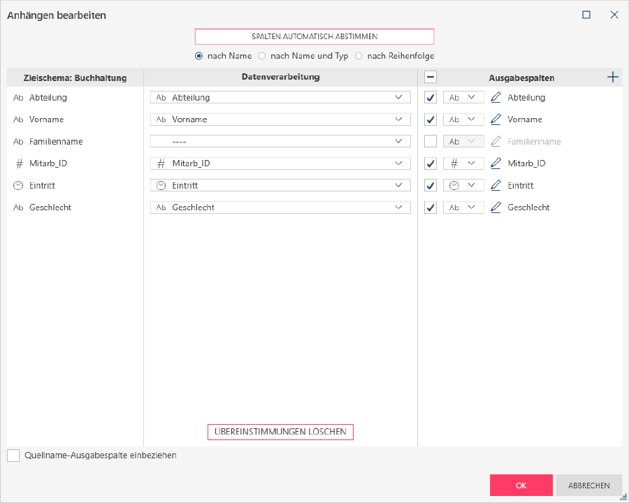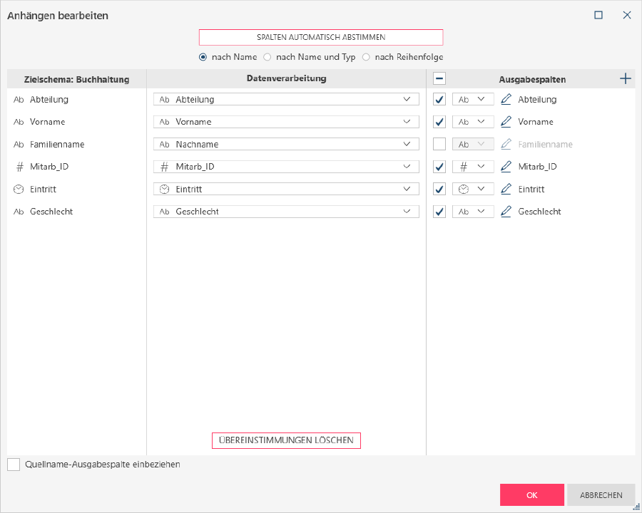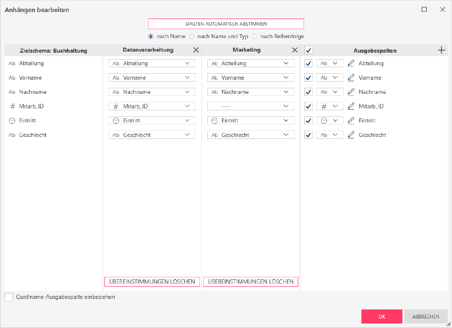 Spalten automatisch abstimmen hilft beim Definieren des Anhangs durch Übereinstimmen der Spalten anhand der ausgewählten Kriterien (nach Name, Name und Typ oder Reihenfolge). Beispiele für diese Übereinstimmungstypen finden Sie hier.