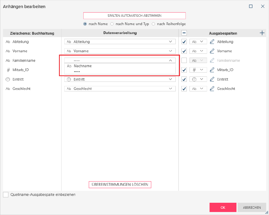 Beachten Sie bitte, dass keine vollständige Übereinstimmung erreicht werden kann, wenn die Datentypen der abzustimmenden Spalten unterschiedlich sind (z. B. die Spalte „Geschlecht“ in der Abbildung oben). Stellen Sie in diesem Fall sicher, dass die Datentypen im Fenster „Vorbereiten“ identisch sind und starten Sie das Dialogfeld „Anhang bearbeiten“ neu, um die Spalten abzustimmen.
