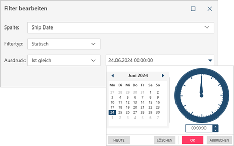 Um statische Filter zu definieren, wählen Sie einen Operator aus und legen Sie den Datums-/Uhrzeitwert fest.