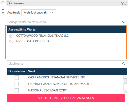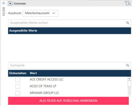 neben einem ausgewählten Wert klicken, wird dieser Wert aus den Filterkriterien entfernt und wieder in die Liste der möglichen Werte aufgenommen. -