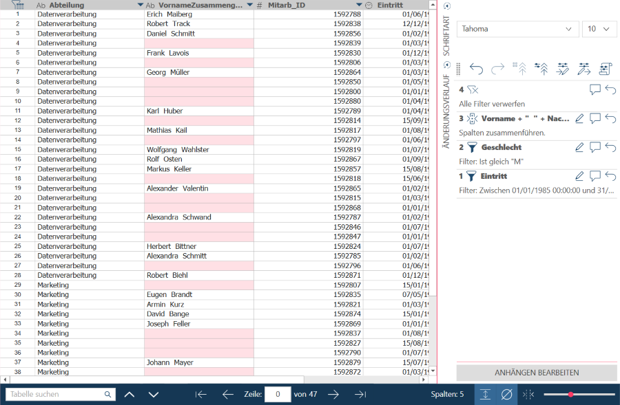 Mit dieser Funktion können Sie unerwünschte Daten aus den in der Tabelle angezeigten Datensätzen entfernen, damit Sie nur mit den gewünschten Daten arbeiten können. Gefilterte Spalten tragen das Filtersymbol links von der Spaltenüberschrift.