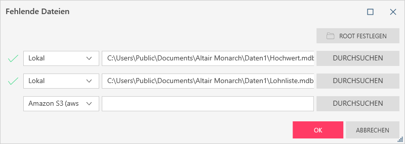 Klicken Sie in diesem Dialogfeld auf Durchsuchen, um das Dialogfeld „Öffnen“ (oder den Cloud-Browser) aufzurufen und die Eingabequellen zu finden, durch die ihre Tabellen ersetzt werden sollen. Sie können auch einen Root-Ordner anlegen, von dem aus die Ersatz-Dateiquellen abgerufen werden können. Klicken Sie hierzu auf Root festlegen.