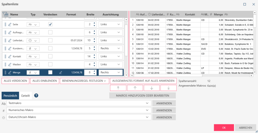 Die Anzahl der in der Tabelle enthaltenen Spalten und die darauf angewendeten Makros anzeigen