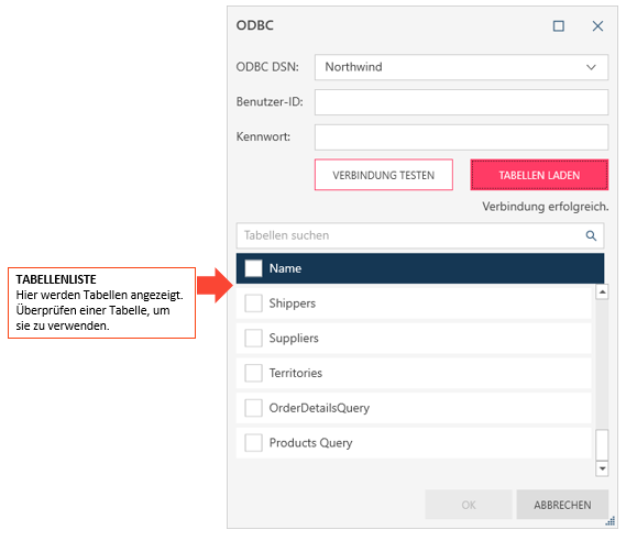 Lädt die Tabellen der Datenquelle. Die Tabellen werden in der Tabellenliste angezeigt. |