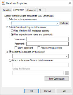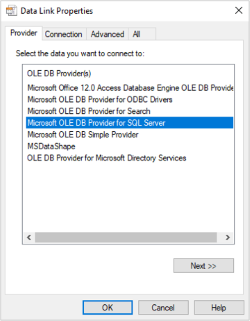 Dieser Connector geht davon aus, dass bereits eine OLEDB-Datenquelle erstellt wurde. Wenn diese Auswahl getroffen wird, erscheint das Dialogfeld „Datenverknüpfungseigenschaften“: