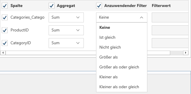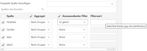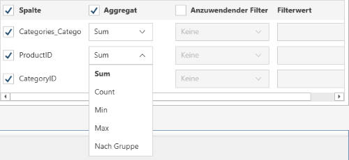 So aggregieren Sie Spalten: Wenn die zurückgegebenen Daten aggregiert werden sollen, markieren Sie in der Kopfzeile das Kästchen Aggregieren und wählen Sie anschließen die Aggregationsmethode für jede Spalte aus.